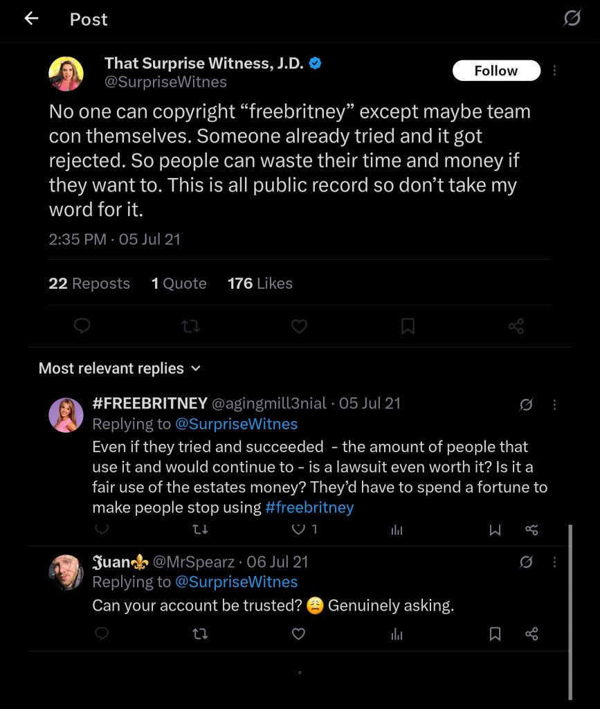 “No one can copyright ‘#FreeBritney’ except maybe team con themselves. Someone already tried and it got rejected. So people can waste their time and money if they want to. This is all public record so don’t take my word for it.”
