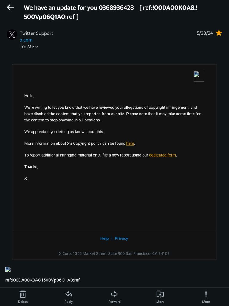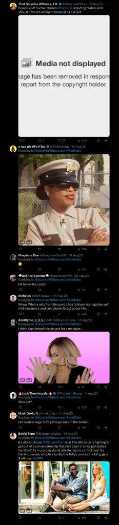 On August 14, 2023, Brittany Courville posted a tweet accusing me of abusing YouTube’s copyright reporting feature. The tweet included a copyrighted image of me, which she used without permission. I filed a takedown request with X, and they removed the image for copyright infringement.