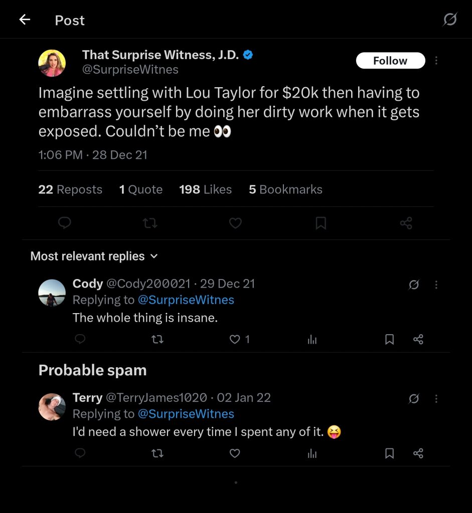 The settlement in question involved a resolved civil matter, not an admission of wrongdoing. Brittany’s tweet created a misleading impression that I had been exposed, embarrassed, or was “doing [Lou Taylor’s] dirty work” — none of which reflects the actual legal record.